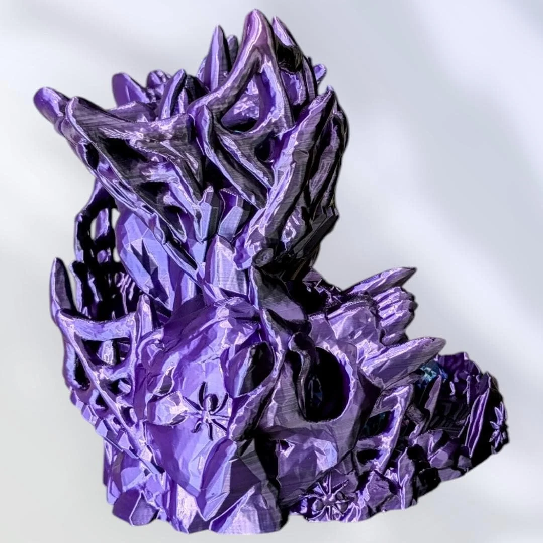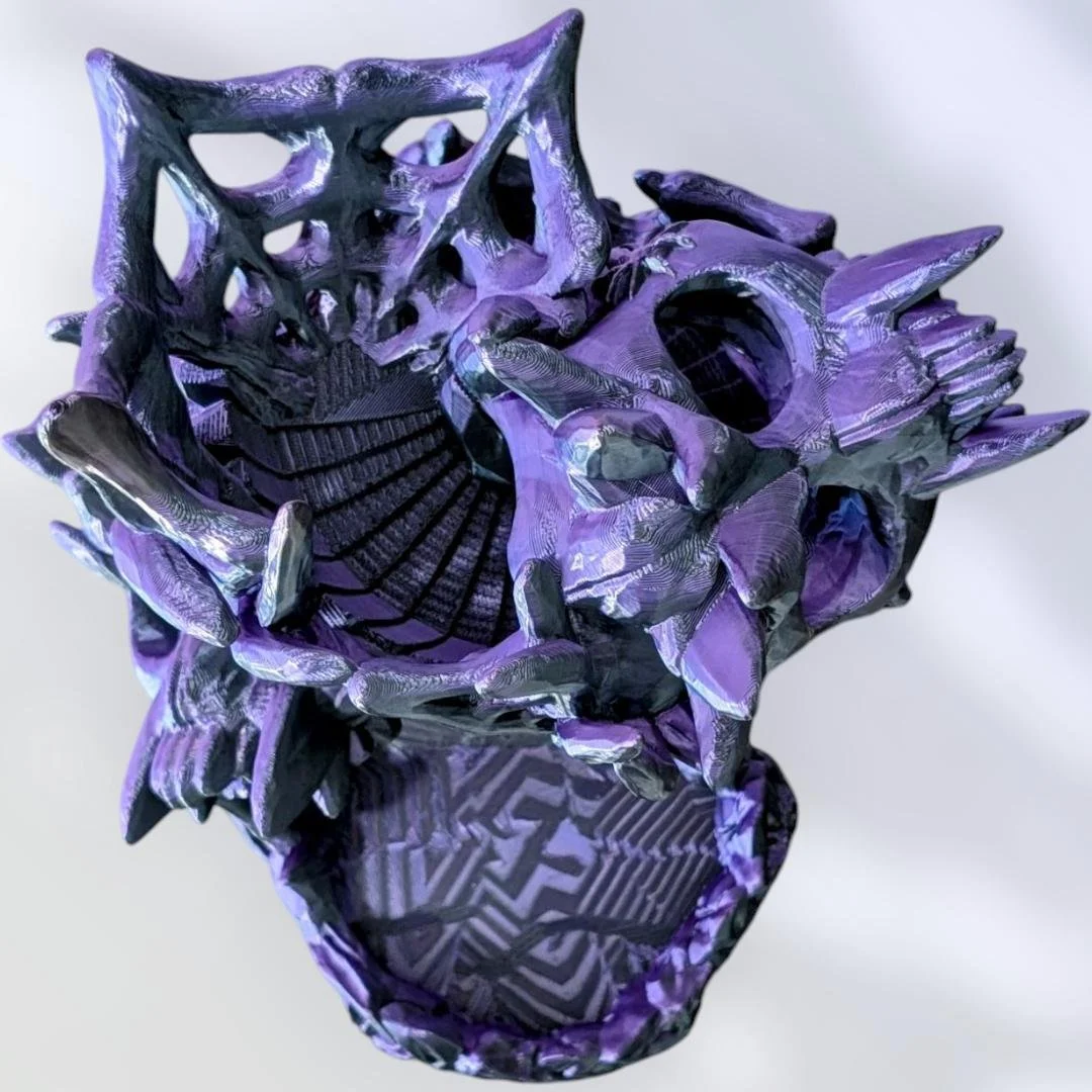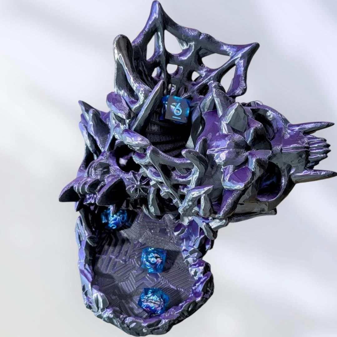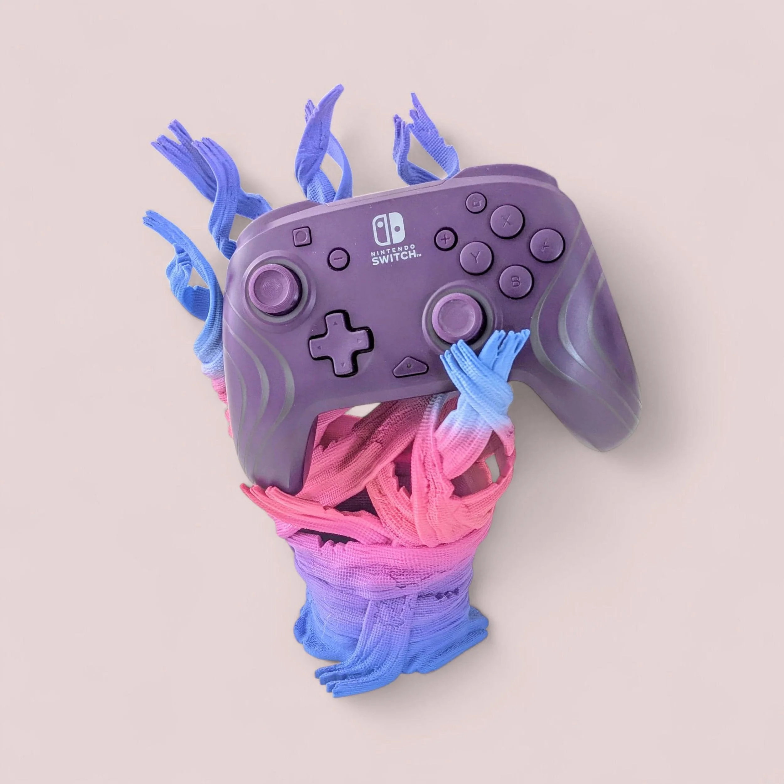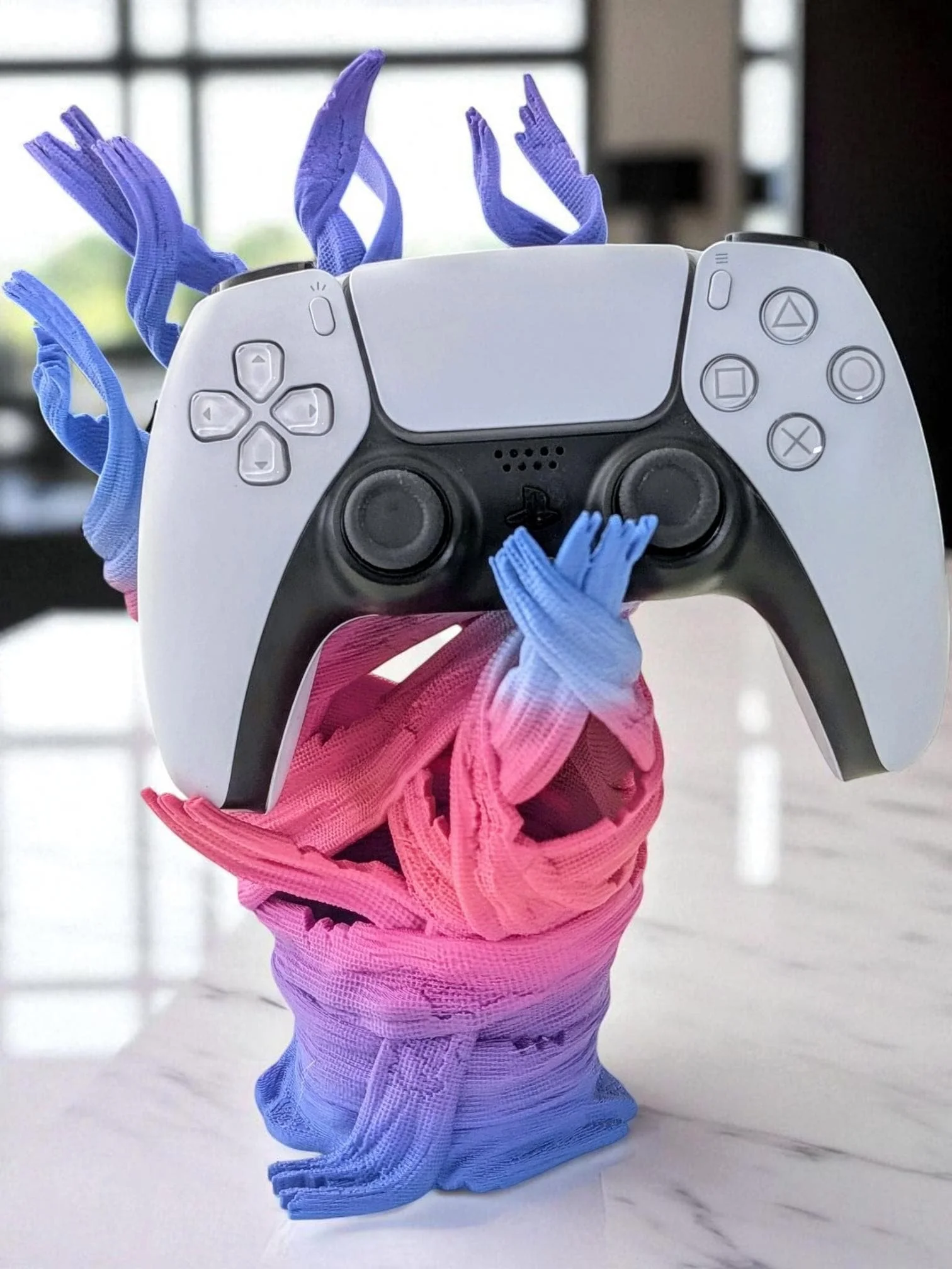 A collection of figures including a colorful Geode-inspired Xbox controller stand, a haunted house backdrop with small Cthulhu and zombie figures in a haunted house scene, and a set of spooky ghosts with a graveyard playset .